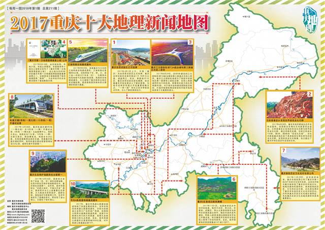 重庆日报讯 (记者申晓佳)2017年刚刚过去,哪些重要事件改变了我们的生活?1月3日,在重庆市规划局指导下,重庆市地理信息中心、重庆地理学学会地理文化与科普专业委员会、重庆地理地图书店联合发布《2017重庆十大地理新闻地图》,一图呈现上述部门联合评选的2017年发生在重庆的十大地理事件。中国(重庆)自由贸易试验区正式挂牌、云阳普安乡发现世界级恐龙化石群、重庆江北国际机场T3A航站楼和第三跑道正式投入使用等均入选其中。