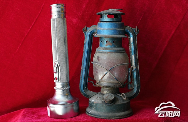 展厅一角,摆放着一盏煤油马灯和一只长柄手电筒。这两样物件看上去已颇有些年代了。马灯是深蓝色的,漆面有多处剥落,灯座锈迹斑斑,早已辨不出颜色。灯座上有一个旋钮,用来调节灯芯。玻璃灯罩尚完好无损,只是蒙了一层厚厚的灰,透过灯罩,依稀可见残留的灯花。这盏马灯静静地立在那里,仿佛一位饱经风霜的老者,虽已是人生暮年,却无法掩盖曾经的荣光。旁边那只银色的手电筒,手柄细长,上面有一个凸起的按钮和红色指示灯。筒身虽不见多少锈迹,上面的螺纹却被磨平,握在手中光滑而冰凉。