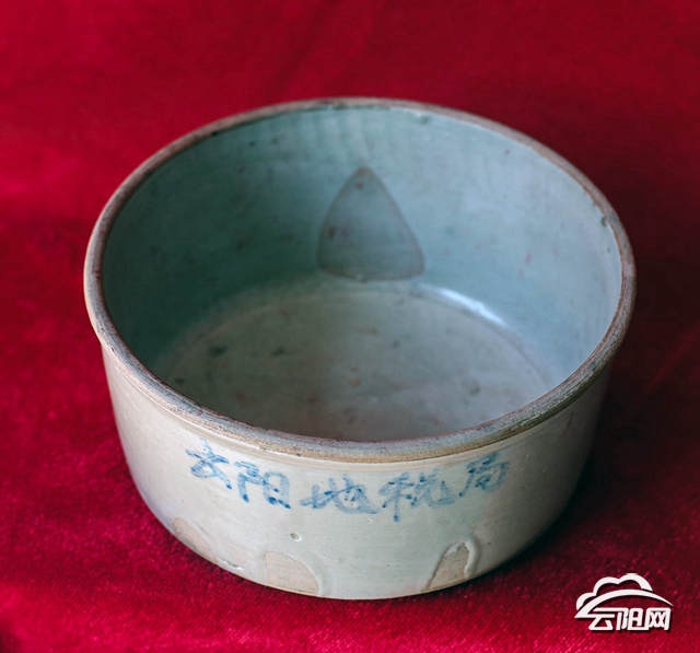 这只浅蓝色的饭钵,口大底浅,质地粗糙,而且还有不少瑕疵。饭钵外面用蓝色油性笔写着“云阳地税局”五个大字,颜色已逐渐裉去,从中也可看出这只饭钵经历了多少岁月,成了地地道道的“老物件”。