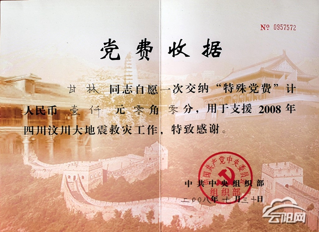 “聚少能成多,一千元做不了什么,但千千万万个一千元就很多了。”这是甘林捐款时,对募捐的同事说的一句话。此时他已身患绝症,面临每年10多万元的医疗费用支出。正如他所言,聚少成多,聚沙成塔,一笔笔捐款涌向汶川,汶川才能迅速重建。为鼓励甘林无私奉献的精神,中央组织部特为他开具了一份精美的、如证书般大小的“党费收据”,上面写着:“甘林同志自愿一次交纳‘特殊党费’计人民币壹仟元零角零分,用于支援2008年四川汶川大地震救灾工作,特致感谢。”