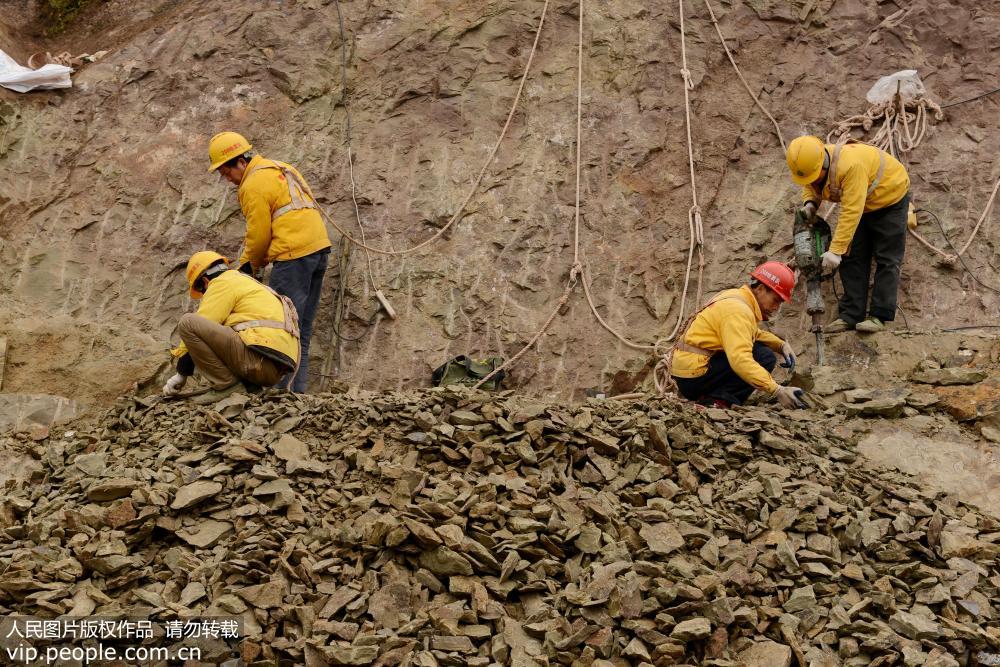 2018年1月20日,地质工作人员在发掘恐龙化石。重庆市云阳县普安乡世界级恐龙化石遗址四区发掘工作已于近日启动,与已成功发掘世界上单体最大的侏罗纪恐龙化石墙的一区相比,四区的地层更老,可以发现更老的恐龙属种,或者说恐龙的祖先,从一区到四区的时间跨度达到了上千万年。目前,已经在四区发掘各类恐龙化石100余块,种类有基干蜥脚类、蜥脚类、兽脚类、鸟脚类、水生爬行类等。