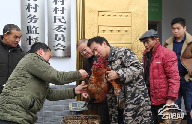 在收购现场,贫困户们纷纷抱着自家养殖的鸡上称,工作人员有条不紊地登记付款