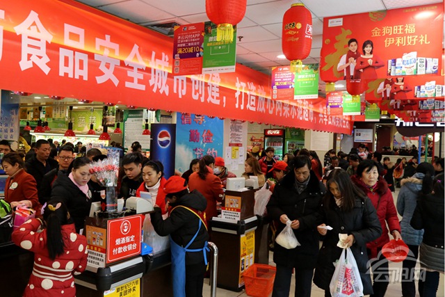 云阳网讯(实习生 陈美岑 牟丹)离春节越来越近,各大超市也进入最后的年货销售冲刺期。2月13日,记者在新世纪看到,前来购物的市民络绎不绝。