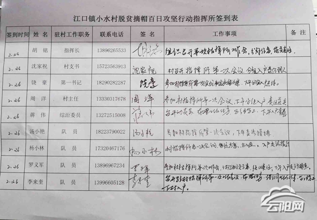2月26日早上8点,在江口镇小水村便民服务中心脱贫摘帽攻坚行动作战指挥室,县教委扶贫工作队员在指挥长胡铭的指挥下,明确了具体工作内容、责任、工作时间、工作纪律等。