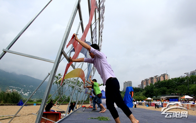 • 云阳网讯(实习生 邓庭庭 郑红均)5月18日,2018年全国沙滩排球巡回赛云阳站继续第二天的比赛,记者在现场看到恢复赛场的工作人员正在修建舞台背景架。