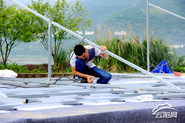 云阳县文化委工作人员余浪说:“昨晚受大风影响,比赛现场部分设施吹倒,为保证比赛正常进行,我们组织了施工人员从早上6点不停歇地忙到7点40分,尽快地恢复赛场,希望能给参赛人员一个更好的比赛环境。”