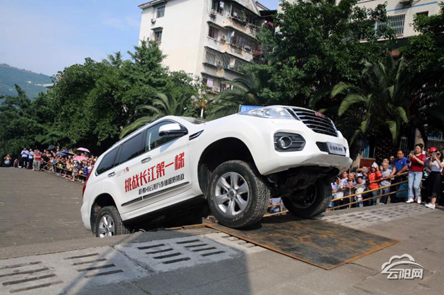 上午9点30分,开幕式广场已是人山人海,而广场上屹立在一旁的"挑战长江第一梯"的红色字样牌子在烈日下显得格外的醒目。车手在以无改装越野车单车挑战登云梯的形式,驾驶一辆哈弗H9越野车从群益广场沿登云梯一路沿阶梯上行,奋力攀爬至梯顶牌坊。挑战赛赛道宽度为3米,从群益广场至云顶广场共有827步台阶,31个平台。在现场观众的惊叫与喝彩声中,哈弗H9成功征服素有长江第一梯之称的重庆云阳登云梯。
