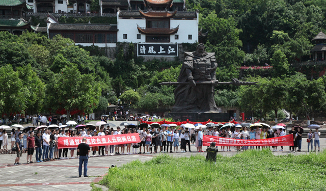 云阳网讯(记者 段斯斯 实习生 刘浮生)5月19日,参加“云阳龙缸首届大学生交友旅游活动”的1040名大学生来到了活动首站张飞庙,贴“忠”字喝摔碗酒,并参观张飞庙。
