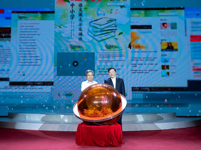 • △中宣部副部长、中央广播电视总台台长慎海雄,教育部部长陈宝生共同见证“中小学语文示范诵读库”首批100篇音频教材正式上线发布。(摄影:新华社记者 沈伯韩)