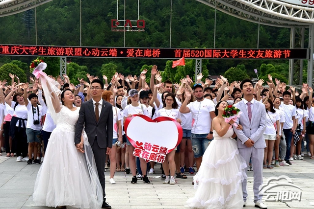 “3、2、1,大家一起跳起来!”5月19日,夜幕降临后,在云阳龙缸售票厅的广场上,随着倒计时结束,篝火被瞬间点燃,在身着节日盛装的土家儿女带领下,1000余名大学生手拉手围着篝火欢快地跳起摆手舞,场面震撼。跳完传统的摆手舞后,大家意犹未尽,又踏着节拍,跳起了时下流行的兔子舞、海草舞。在火光的映照下,众人还合唱起《小幸运》,轻快的旋律和挥动的荧光棒让现场沉浸在一派欢乐气氛中。