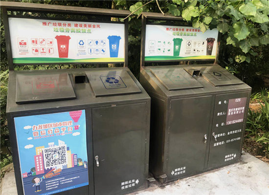 金凤镇自行设计、制作的脚踏式分类垃圾箱(初梓瑞 摄)