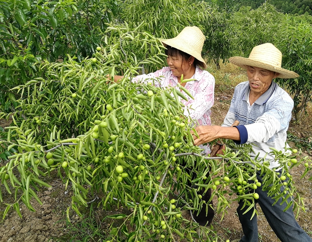 6月24日,南溪镇盐渠村的冬枣示范基地里,工人们正在将弱果、坏果、小果全部摘掉,确保冬枣的质量和口感。据悉,该基地有冬枣200亩,预计在9月份进入采摘期。(王彬彬 摄)