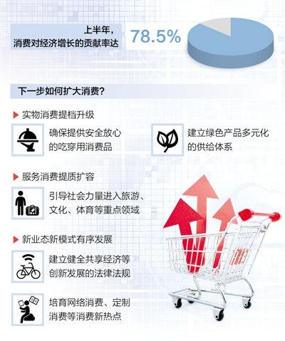 上半年,我国社会消费品零售总额达18万亿元,同比增长9.4%,消费对经济增长的贡献率达78.5%。下半年,面对新挑战,消费运行走势将如何?作为经济增长的“压舱石”,进一步扩大消费的潜力在哪里?国家发展改革委2日召开专题新闻发布会,介绍相关情况。