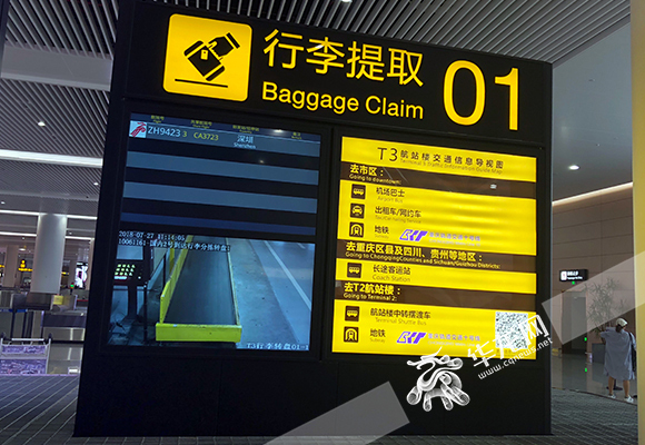 可视化行李系统——T3航站楼今年2月已推出行李“可视化”系统,国内、国际到达共13个行李提取转盘,均安装了电子显示屏。行李传送带前方的摄像头负责把搬运画面实时投放在显示屏上,旅客在行李提取处等候时可观看行李搬运“直播”,自己的行李到哪了一目了然。