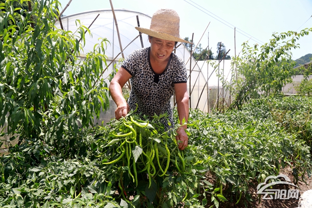 近日,在后叶镇吉庆村的生态蔬菜大棚基地里,工人们正在采摘辣椒。据悉,该基地有大棚蔬菜100亩,种植有生姜、西兰花、番茄、辣椒等时蔬,年收入达20余万元,解决了当地20个村民就业,月收入2000元左右。(王彬彬 摄)