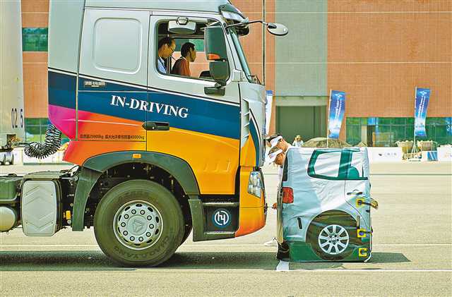 • 8月18日,两江新区中国汽车工程研究院园区,i-VISTA自动驾驶汽车挑战赛上,工作人员正在测量重型卡车的比赛成绩。记者郑宇 摄