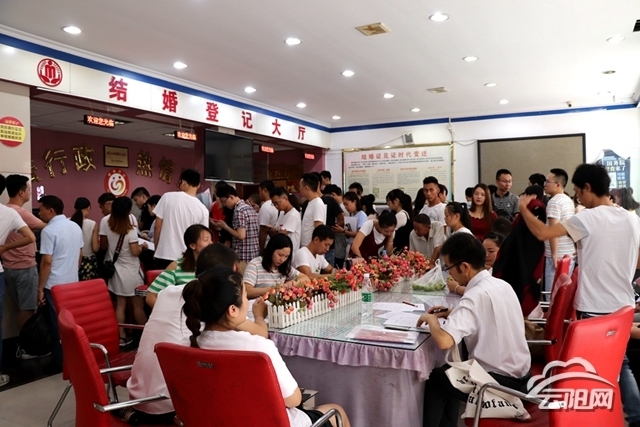 当天下午,记者来到县民政局登记大厅,看见资料填写台、颁证窗口等地依然排着长队。工作人员贴心地给每一对情侣发了号牌,以免混乱和不必要的等待。据工作人员介绍,当天来登记的人数是往常的三四倍,截至下午7点,共有160余对新人登记领取了结婚证。