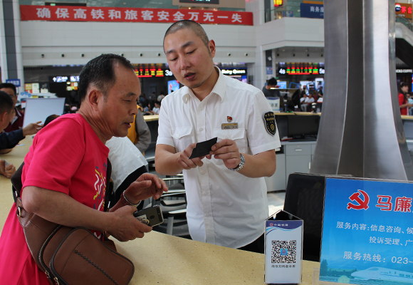 值班站长赵伟杰为旅客提供服务。 重庆火车站供图 华龙网发