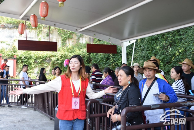 志愿者身着红色靓丽的志愿者马甲分别在景区游客服务中心和北门、南门的主要出入口,以及天河广场发往云端廊桥、龙缸南门、大安洞的观光车驿站点等主要游客集散点开展引导和咨询、劝导不文明行为、维护游人乘车秩序、提供便民服务等活动,既弘扬了“奉献、友爱、互助、进步”的志愿服务精神,也扮靓了景区风景。