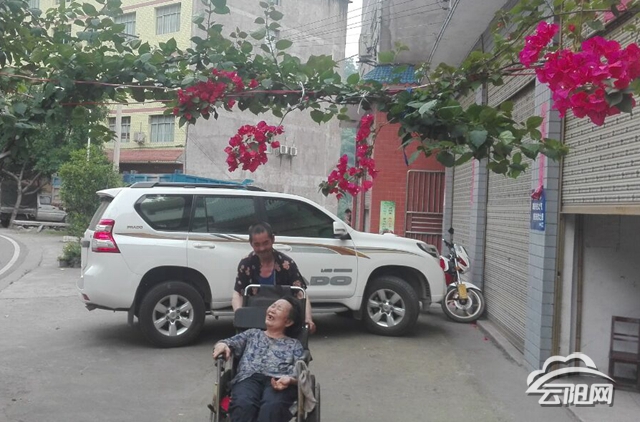 推轮椅的老人叫何启明,今年75岁,是渠马镇促进村二组人,曾担任生产队长30年。轮椅上的人是他的妻子胡世英,与何启明同龄,患脑瘫10年了。