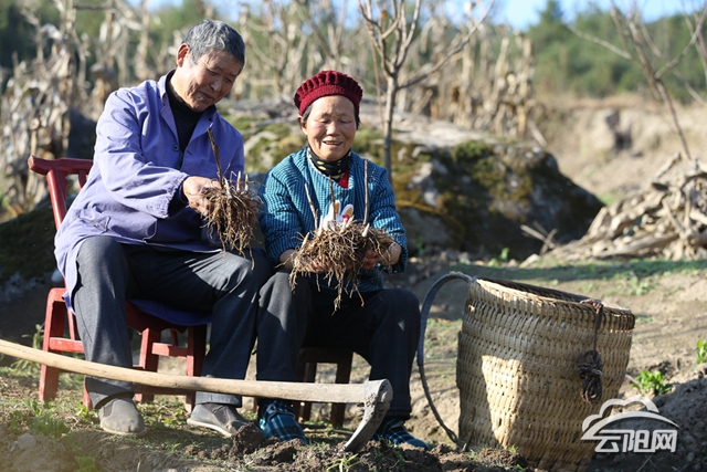 “这种植物,要三年生长期,目前在地里已生长两年多了。它开花非常漂亮,清新可人,香气浓郁,我们都叫它'神仙草'。”夕阳下,杨青山和老伴小心翼翼地刨开松软厚实的土壤,不大功夫,带着根须和块茎的神秘药材就露出真容。