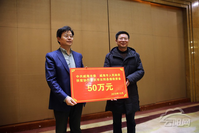 会议现场,威海市委市政府为云阳县捐赠帮扶资金50万元。