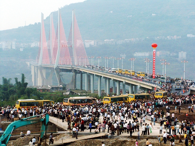 65.云阳长江公路大桥 2002年11月6日,云阳长江公路大桥正式开工。修建长江大桥,县委、县政府投资1.84亿元,全县群众共捐资355872元。云阳长江大桥是三峡库区二期蓄水前开工的最后一座公路大桥,也是三峡库区唯一的高低子母塔斜拉桥,全长1278.6米,桥面宽度18.5米,是省道开(县)利(川)线上重要的交通枢纽。2005年9月28日建成通车,结束了云阳被长江分割的历史,连接了以新县城为中心的全县南北交通网络,对云阳社会经济发展起着巨大的推动作用。