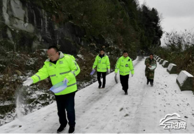 • 云阳网讯(记者 李充 通讯员 伍远洋)1月3日,在大阳镇庆霞村一条山乡公路上,该镇组织的安监办人员和村社干部及群众,采用撒盐等技术,清理路面积雪,确保道路交通安全。