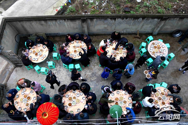 中午12点,血旺汤、回锅肉、水滑肉……一道道美味佳肴接连端上桌,色香味俱全,让游客垂涎不已。坝坝宴开席了,游客们开心地举起酒杯,品尝特色美食,共饮和谐美酒,在热闹的气氛中感受新年的味道。