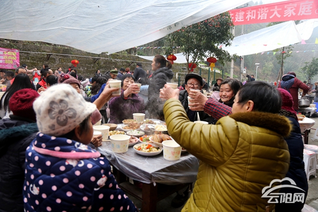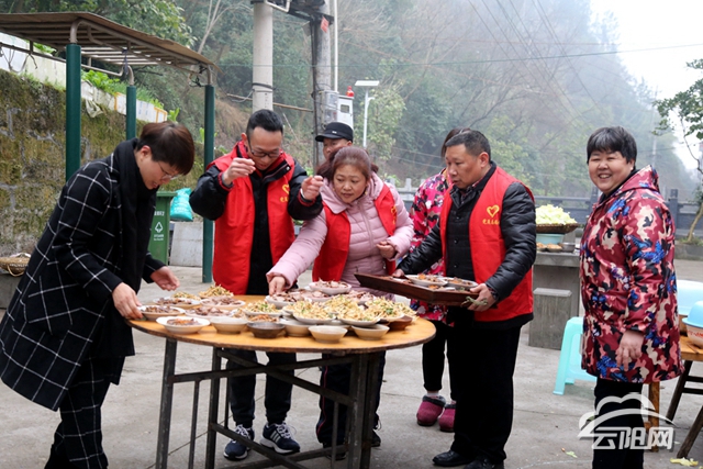当天,居民们早早的来到小区院坝,相互拜年拉家常。党员们还和社区群众们一起进行团年宴的前期准备工作,切菜、炒菜,大家各抒己见,为一道道美味的菜肴使尽浑身解数。中午11点30分,团年宴正式开席,热气腾腾的饭菜端上桌,年味也越来越浓,居民们一边品偿美食,一边拉着家常,频频举杯庆祝新年到来,现场不时传出阵阵欢声笑语,呈现出一派欢乐祥和、邻里和睦的景象。
