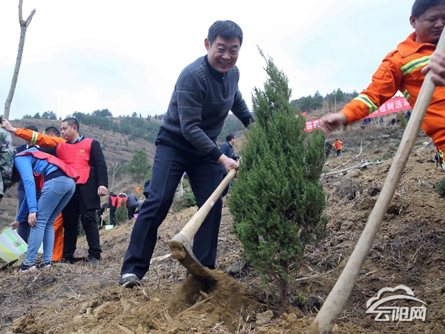 植树中,覃昌德挥锹铲土、踩实压紧、护苗浇水,精心栽好每一棵小树苗。他说,生态是云阳的资源优势,一定要牢固树立绿色发展理念,切实筑牢生态屏障,大家要广泛开展建设“人大代表林”“政协委员林”“机关党员林”“教师林”“医生林”“青年林”“姐妹林”“工会林”等8个“示范林”,率先做好示范带动;要广泛发动干部职工、城镇居民、学生等在本辖区开展全民义务植树,鼓励全县人民踊跃投身“我为祖国植10棵树”全民义务植树活动;要坚定不移爱绿植绿护绿,把我县森林资源培育好、保护好、发展好,努力建设美丽云阳。