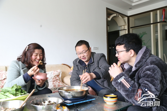 丈夫解开围裙走出厨房,柳春香一家三口围坐在电磁炉旁,儿子讲着今天学校发生的趣事。一碗稀饭,一盆火锅,笑声阵阵。