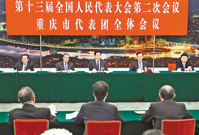 全国人大代表、市委书记陈敏尔主持会议。全国人大代表、国务委员、外交部部长王毅,全国人大代表、中央党校(国家行政学院)常务副校(院)长何毅亭参加。全国人大代表、市委副书记、市长唐良智,全国人大代表、市人大常委会主任张轩发言。
