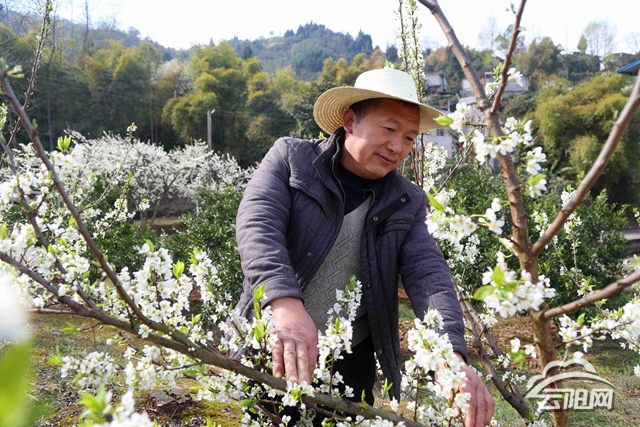 3月14日,黄文军手拿锄头,挖窝后,小心翼翼地将果树苗放入坑中,然后填土、浇水、踩实……他手脚麻利,一丝不苟地种下一棵棵李子树苗。见到记者到来,他赶紧放下手中的锄头,笑眯眯地指着地里的一棵小李子树说:“这些李子树是我正月间刚种下的,等到5月份它就可以结果了。现在天气好,我得再多种上几棵!”