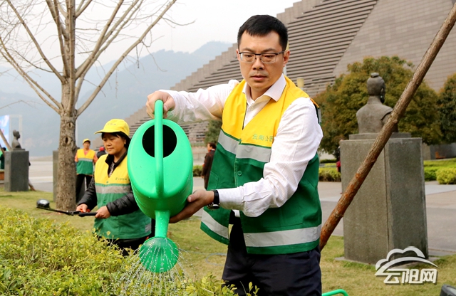仪式结束后,覃昌德、吴久华、李大武、朱锡祥与志愿者一起参加了城市管理体验活动,修剪了两江广场周边绿化带,并为周边的花草浇水。