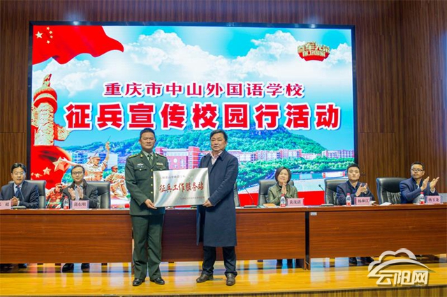 县委常委、县人武部政委肖霄为高中阶段学校“征兵工作服务站”授牌;学生代表上台领取兵役登记证;县教委有关负责人宣读了大学生入伍政策。