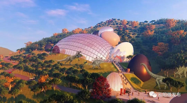 恐龙化石遗迹馆,总建筑面积约2万平方米,以恐龙蛋造型为概念,由九个大小不同的球形建筑参差错落组成,寓意云阳恐龙基因由此发掘和得以延续,主要展示化石遗迹实景。