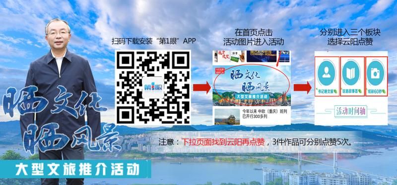 友情提示:云阳参加的“晒文化.晒风景”大型文旅推介活动在”第1眼“客户端有“书记晒文旅””区县故事荟“”炫彩60秒“三个板块,每天每个手机号码可以各点5次赞!点赞投票将截止到4月4日,仅剩四天时间!
