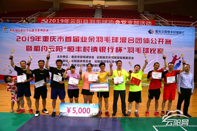 • 云阳网讯(记者 丁齐 实习生 刘超)5月26日,由市羽毛球协会、县文旅委主办,县体育总会、县羽毛球协会承办的2019年重庆市首届业余羽毛球混合团体公开赛暨云阳“恒丰村镇银行杯”羽毛球赛在云阳体育馆圆满落幕。