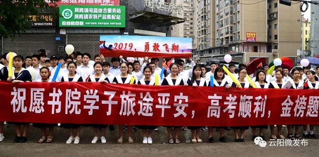 早上6点30分左右,交巡警纷纷到达了凤鸣、红狮等乡镇学校,此时,接送考生们的车队已准备就绪。虽然天下着大雨,但学生们依然精神抖擞,在民警的指挥和引导下,井然有序地排队出校门、上车。有不少考生家长前来送行,给孩子一个加油的拥抱;还有不少高一、高二的学弟学妹们为即将步入考场的师哥师姐呐喊助威,一声比一声高的“高考,必胜”响彻在雨中。