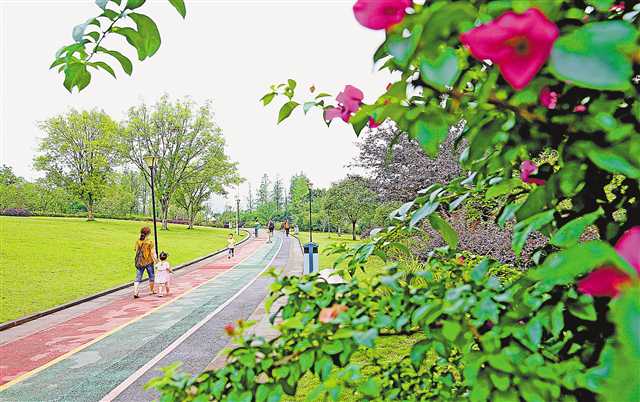 6月10日,巴滨路茶花广场,市民在公园内赏景。
