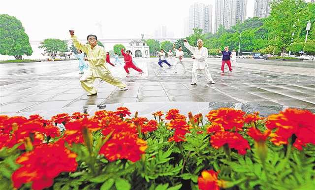 6月10日,九滨路九龙外滩广场,市民在广场上打太极拳健身。