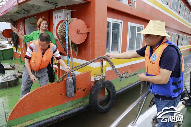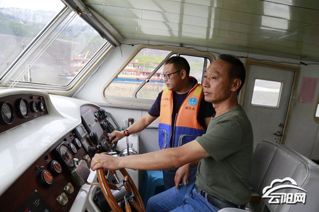 一年365天,袁军每天都在云阳长江段航行几十公里,他早上7点半到达码头,检查船舶各种设备,给机舱做卫生,确保船舱干净、整洁。船只8点半准时从码头出发。这段时间正是汛期,而长江里的水位下降快,他们航行的重点工作就是提醒过往船舶遵守水上交通秩序,确保安全航行。在工作中,袁军用文明语言与过往船只进行交流,提醒船只注意安全。