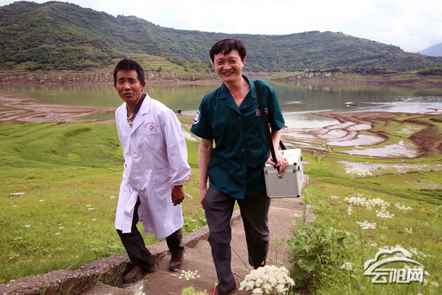 6月18日,云阳县高阳镇签约医生张孝明、赖真权摇着小船,背着药箱到团堡村,深入农户,为贫困农户检查身体,指导贫困户就医、用药。