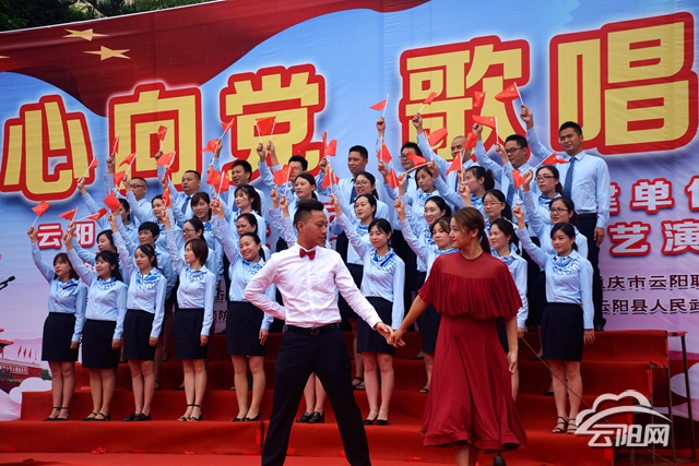 云阳网讯(实习生 刘超)6月24日,青龙街道白云社区与辖区内共驻共建单位联合开展“民心向党,歌唱祖国”白云社区庆祝建党98周年暨建国70周年文艺演出,共千余人齐聚在白云社区彭咏梧广场为党和祖国庆生。