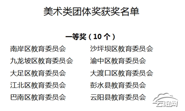• 云阳网讯(记者 杨梅娜)日前,市教委公布2019年中小学音乐美术教师教学技能展示活动获奖名单,云阳县教育委员会获得美术类团体一等奖;养鹿中学肖伋、民德小学张凌云获得美术类(书法)个人奖一等奖;立新小学苏基石获得美术类(绘画)个人奖二等奖;院庄中学丁娜获得美术类(绘画)个人奖二等奖;云阳教师进修学院滕达、杏家湾小学谭天琼获得美术类(手工)个人奖二等奖。
