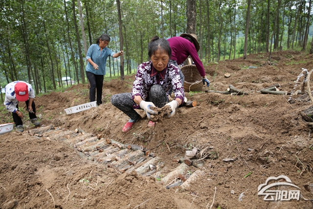 云阳网讯(记者 王彬彬)7月12日,记者在南溪镇大吉村看到,村民们正在绿树环绕的天麻基地种植天麻,一段段菌种木铺在掏好的沟里,等待后面的村民来培上合适的土壤。