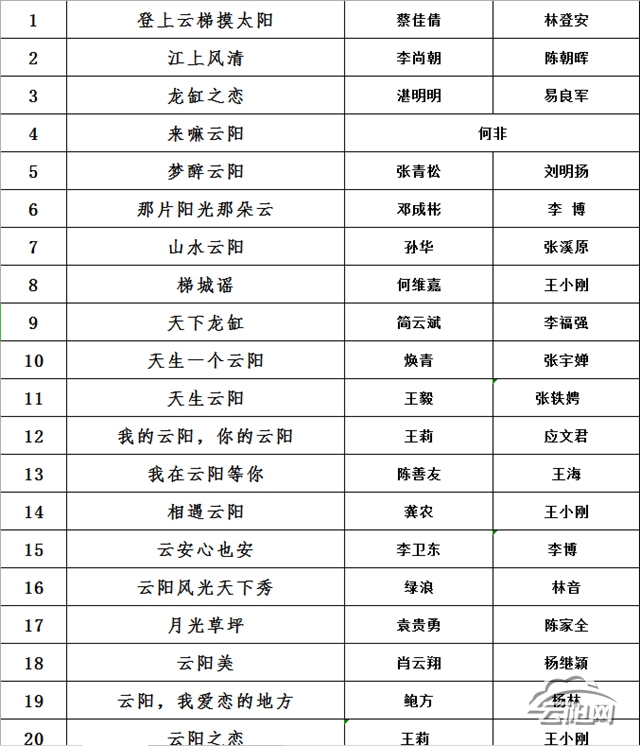 • 云阳县旅游歌曲征集活动20首入围歌曲名单正式出炉