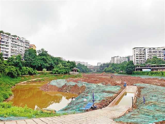 7月12日,细雨蒙蒙,渝北区双龙湖公园里,几台机器正在紧张施工。放眼望去,湖内大半面积已被渣土覆盖。