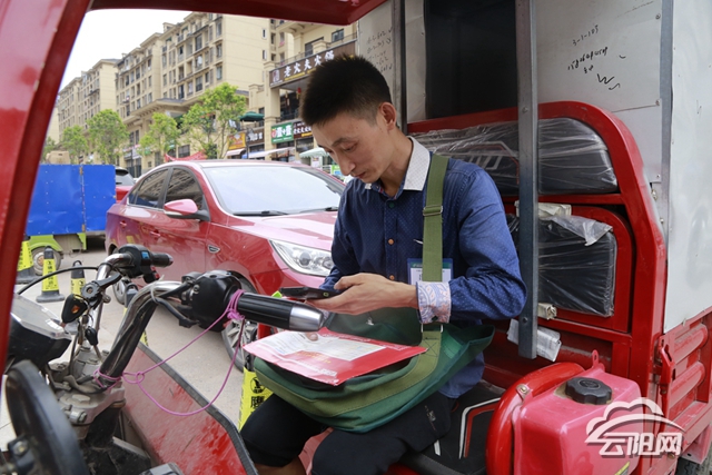 姚建银开着一辆贴有绿色邮政车标签的三轮车行驶在马路上,忙着为被录取的学生送通知书。